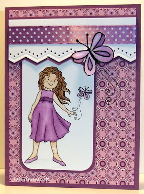 My image is a digi stamp from Fred She Said Designs. My paper scrap drawer has had a lot of good use lately, my patterned paper came from there. It's from PapertreyINK, the dotted satin ribbon is also. I used a Martha Stewart border punch, and did my coloring with Copic markers. To make the second butterfly I enlarged the digi image and printed it again and cut it out.